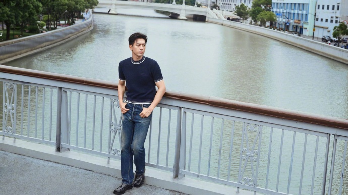 而在其他桥的场景中,李现又换上了不同风格的穿搭。在乌镇路桥边,他身穿藏蓝色针织短袖,搭配复古牛仔裤,脚蹬黑色皮鞋,休闲又不失格调。他随意地倚靠在桥的栏杆上,背后是潺潺流水与城市街景,营造出一种悠然惬意的氛围,让人感受到都市生活中的宁静与美好。