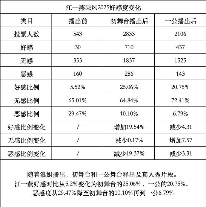 回顾江一燕在《乘风2025》的一路,本以为会成为节目里腥风血雨的她,却温婉平和,谦虚有礼。不论是初舞台,还是每一公的比赛,都靠着实力及性格大大圈粉,让观众不禁感慨原来真正的江一燕如此可爱真诚。更有网友盘点了姐姐们的观众喜恶变化,江一燕凭借舞台和真人秀部分收获了大家的关注,喜恶变化较大,好感度由最初的5.2%变化至峰值25.06%。恶感由起初的29%降至6.79%。尽管在节目中江一燕的镜头并不算多,但她还是通过自身实力、性格魅力收获了一批观众的喜爱。