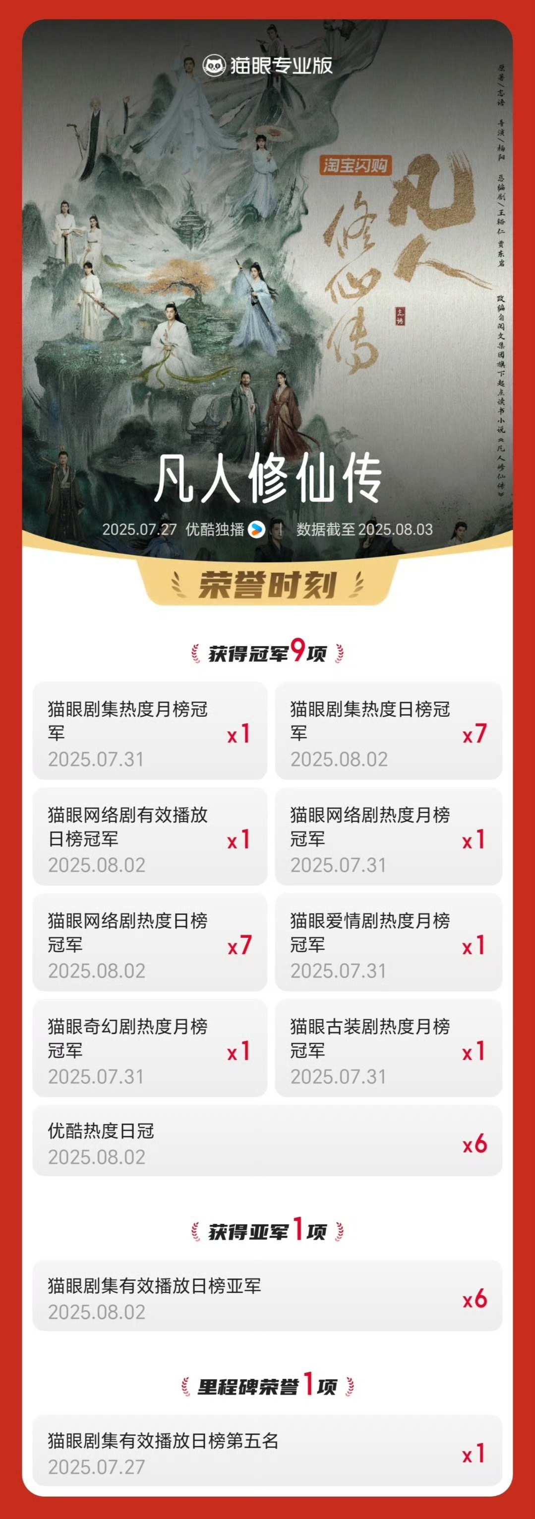 由杨洋领衔主演的《凡人修仙传》自开播以来热度持续上涨。该剧不仅在猫眼、德塔文、vlinkage等国内权威热度榜单上强势蝉联冠军席位,并以破竹之势登顶灯塔专业版“全网正片播放量”首位宝座,更成功辐射海外市场:登顶Netflix中国台湾地区收视TOP1,并在海外权威网站MyDramaList斩获8.1高分,真正实现了海内外观众同步入局的追剧热潮。杨洋以精湛入微的演技成功塑造了从凡人少年起步的韩立,将角色的坚韧、智慧与成长弧光演绎得极具信服力,引发海内外追剧热潮。