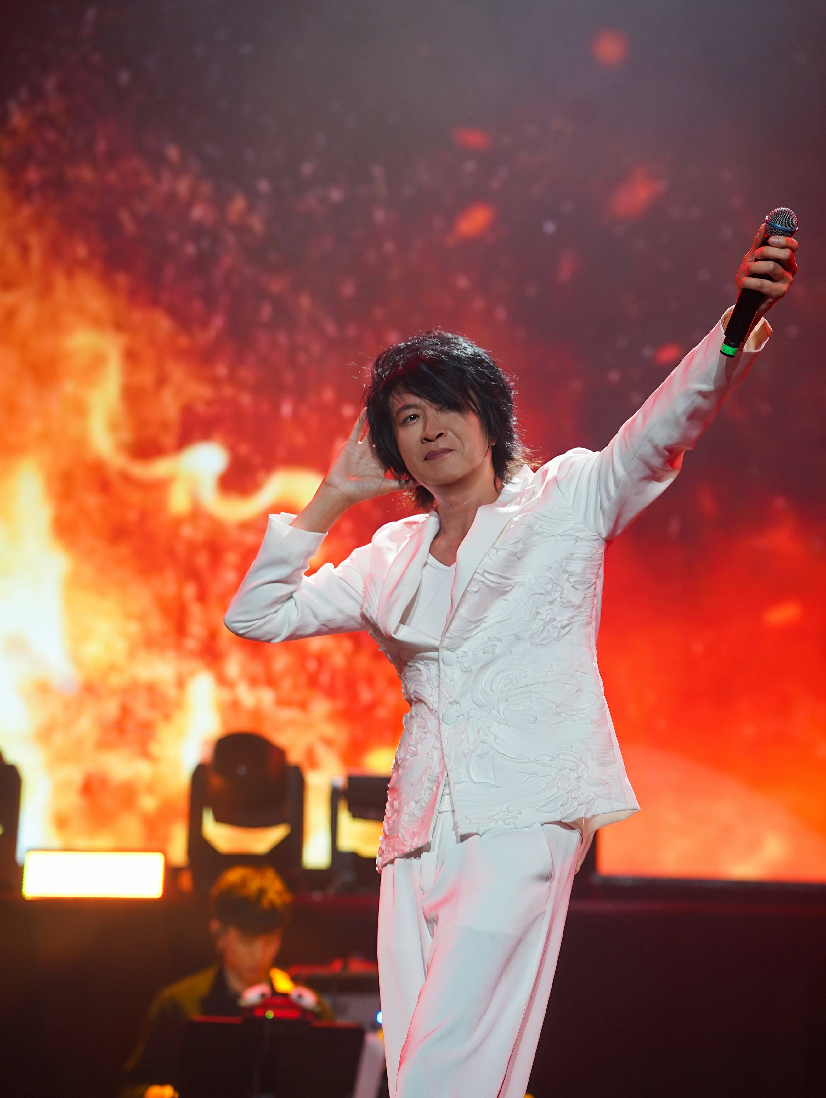 当《下沙》《一天一万年》等经典旋律响起,全场观众情不自禁跟唱——这些刻在青春记忆里的歌曲,是一代人的情感BGM。整场演出呈现20余首金曲,《爱我的人和我爱的人》《孟婆汤》等常年霸占音乐排行榜的作品轮番上演。游鸿明还在演出中更换五套造型,从闪耀流苏上衣到典雅中国风绣花西装,舞台设计与音乐情绪高度契合,视觉与听觉享受相得益彰。