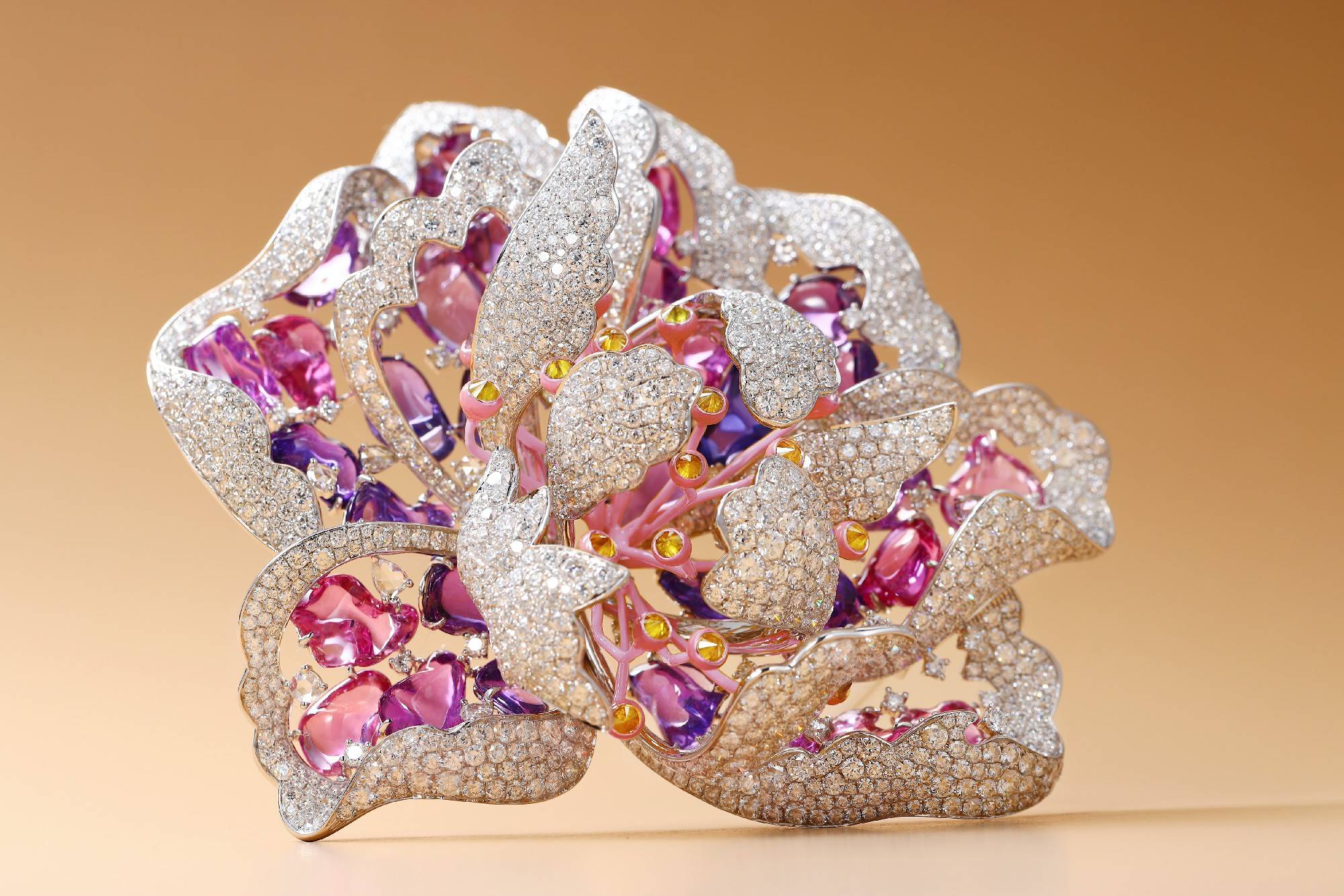 2025年4月,海南海口——LARWINER拉威兒艺术珠宝于第五届消博会的「消博探新首发首秀」新品发布会上重磅发布年度主题作品《PEONY IN THE GOLDEN AGE 盛世开泰》彩色蓝宝石钻石胸针。此作品隶属品牌「国色新四季」高级珠宝系列,以清代宫廷画家郎世宁《仙萼长春图》的牡丹神韵为灵感,将「花中之王」的雍容气度凝练为珠宝艺术,融合东方美学意境与当代工艺创新。品牌创始人梅梅女士强调,作品突破三大工艺极限:运用「立体微镶」技术手工镶嵌1508颗钻石打造花瓣流动光影,以未经完全切割的天然彩色蓝宝石渐变色阶呈现「暧暧内含光」哲学意涵,并透过不对称镶嵌手法彰显牡丹生命力。作品选用紫、粉蓝宝石与黄钻,象征中华文明的智慧积淀与生生不息,同步登上人民日报「全球新品首发首秀」舞台,展现中国高级珠宝的国际影响力。自1997年创立以来,LARWINER高级珠宝匠人坚持全手工制作,融合高级珠宝工艺与东方匠心,此次以《盛世开泰》彩色蓝宝石钻石胸针再度印证传统文化与现代设计的破界融合,向世界传递跨越地域的艺术语言。