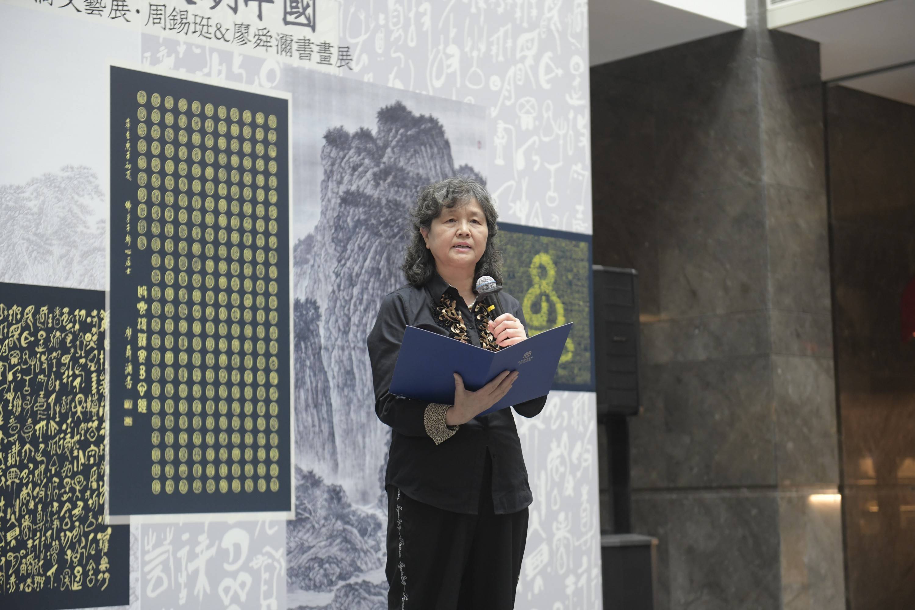 著名导演李建平先生作为特邀嘉宾发言,从创作实践角度分享了独到见解:"作为导演,我始终认为,真正打动人心的艺术,必然根植于深厚的文化传统。今天站在这里,我从周锡珽、廖舜沵两位大师的作品中,再一次感受到了中華文明跨越时空的澎湃生命力。"他进一步阐释道:"周锡珽大师的山水,从传统中走来,却又融入了自己对自然与禅意的独特体悟,笔墨间既有古法的严谨,更有现代的呼吸感,可谓'承古开新'。而廖舜沵大师的书法,大胆解构古文字,以令人惊叹的现代视觉语言,让古老的篆书焕发出全新的魅力,这是一种'以古铸今'的智慧。他们的创作,与我过去参与奥运会、世博会等大型盛典的创作理念不谋而合——我们都在做同一件事:那就是将中華文化的基因,用当代的、国际化的语汇重新表达,让传统'活'在当下。"