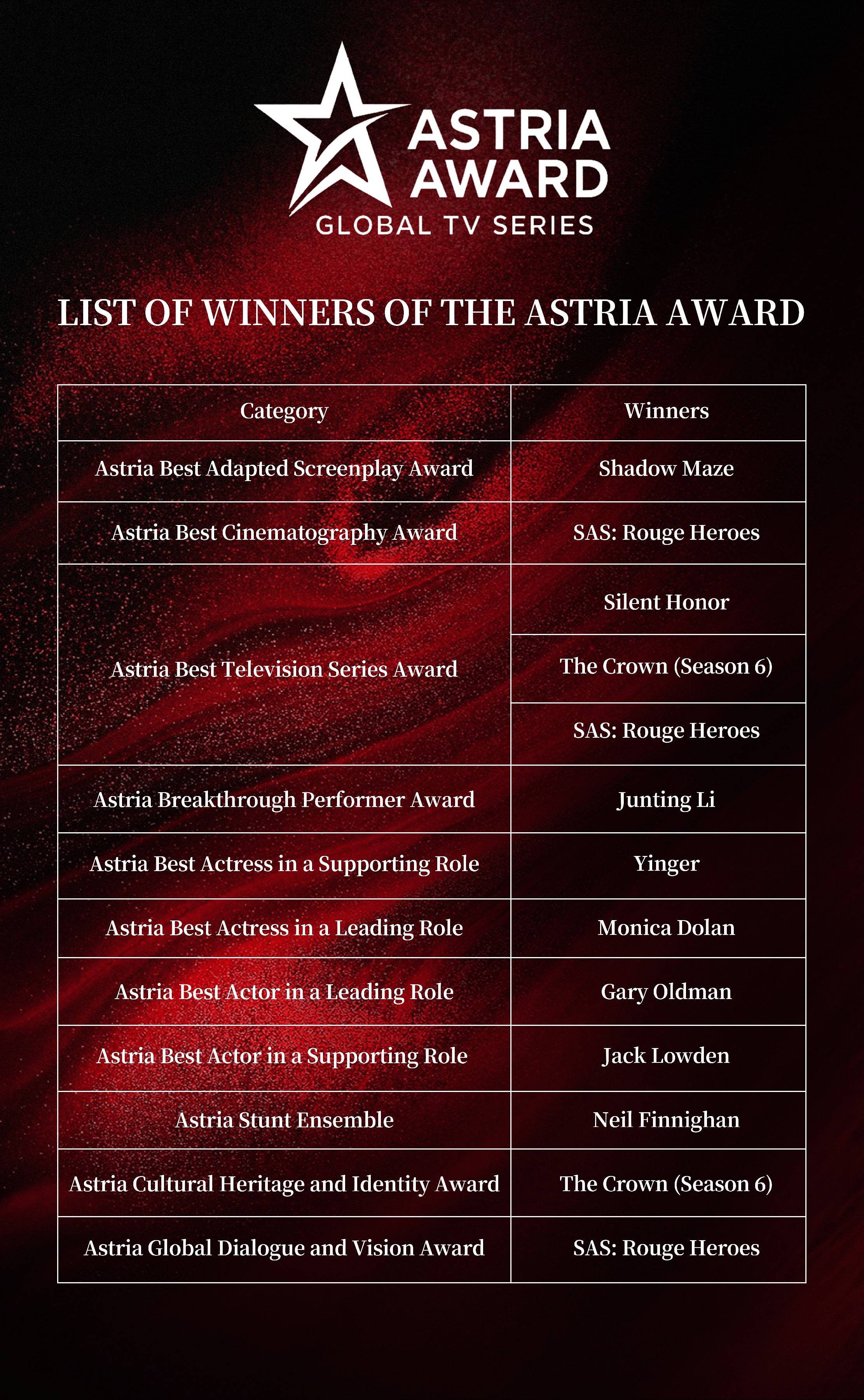 12月14日,Astria星雅奖全球电视剧颁奖盛典在泰国曼谷举行。前段时间热播的谍战纪实传奇剧《沉默的荣耀》,与英国传记历史剧《王冠》第六季、战争剧《SAS:叛逆勇士》,共同获评最佳电视连续剧;英国演员加里·奥德曼、莫妮卡·多兰分获最佳男、女主角;中国内地女演员颖儿获最佳女配角;中国内地男演员李俊霆凭借刑侦悬疑剧《遮云》中核心反派“周衍宸”一角,获评最佳演技突破演员。