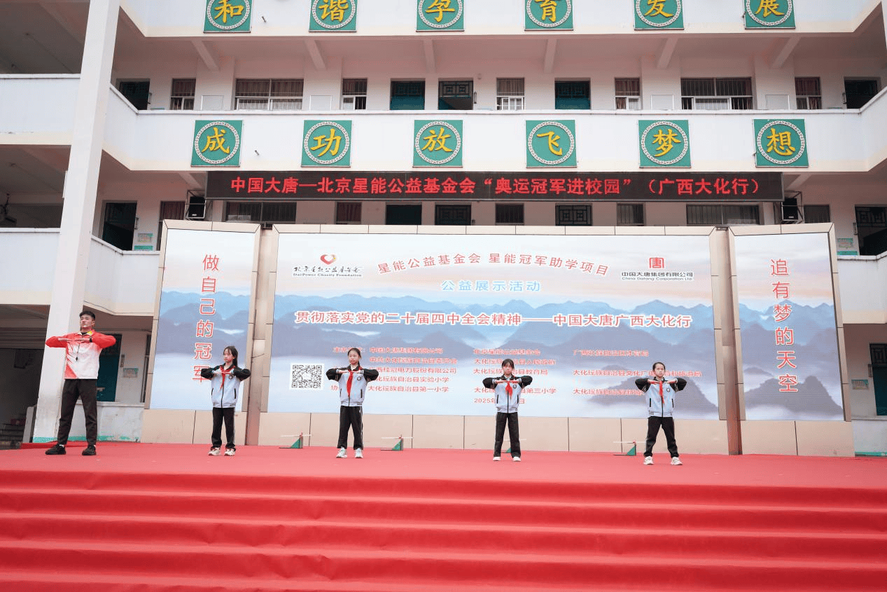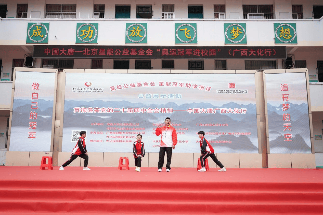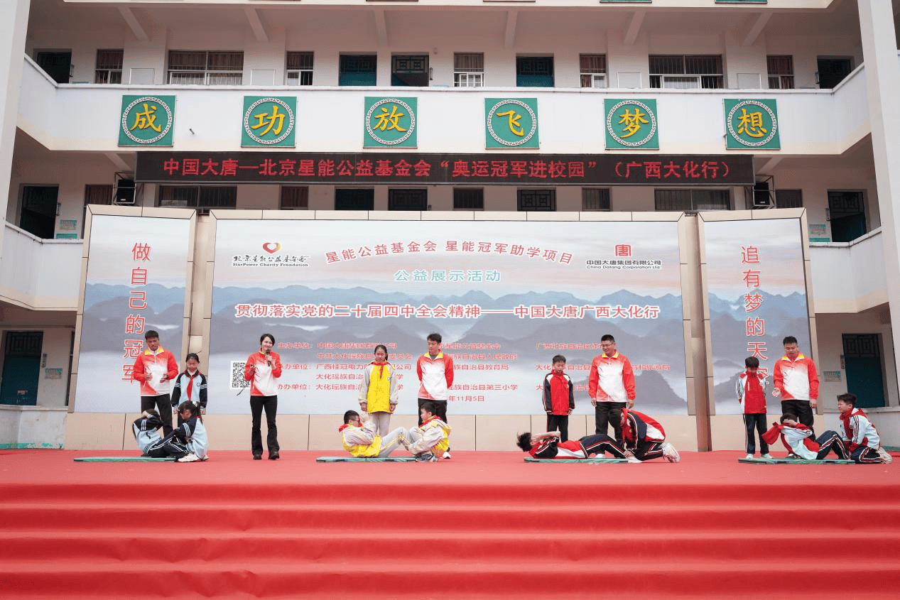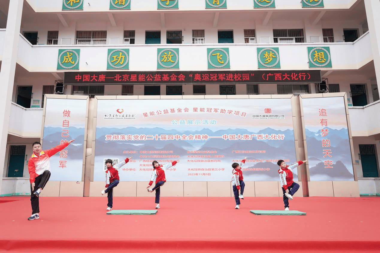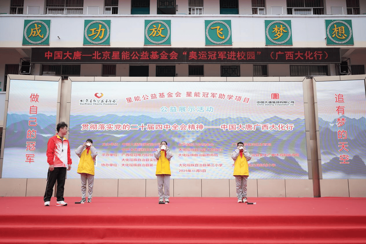 2025年11月5日,“星能冠军助学项目——贯彻落实党的二十届四中全会精神,中国大唐广西大化行”公益展示活动在大化县正式拉开帷幕。由中国大唐集团有限公司、北京星能公益基金会、广西壮族自治区体育局、中共大化瑶族自治县委员会、大化瑶族自治县人民政府联合主办,广西桂冠电力股份有限公司、大化瑶族自治县教育局、大化瑶族自治县实验小学精心承办,大化瑶族自治县第一小学、大化瑶族自治县第三小学、大化瑶族自治县新城小学协同协办。活动受到当地政府高度重视,还覆盖了整个大化县的体育教师。