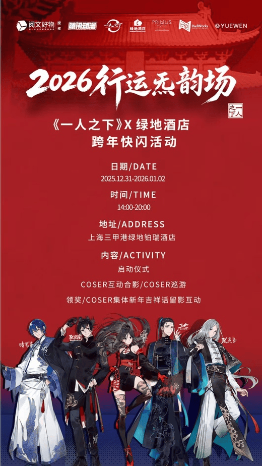 双方围绕“国漫IP+酒店”场景融合、2026跨年“行运炁韵场”活动落地、长期合作模式等核心议题展开深入交流,达成多项共识,正式确认将于2025年12月31日至2026年1月3日推出《一人之下》主题嘉年华活动,为上海跨年元旦假期打造国漫娱乐新地标,且该延展活动将持续至2026年2月28日,让更多消费者在迎新年之际感受国漫与微度假结合的独特魅力。