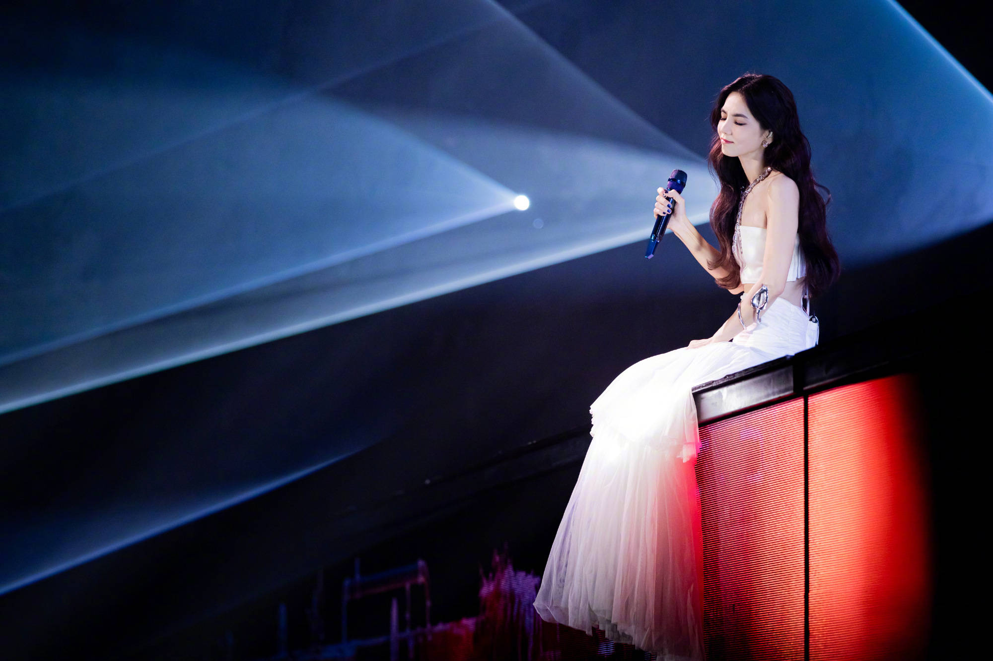 本次广州站的演出制作延续了巡演一贯的高规格与创新理念,以“自我剧场”为核心打造的舞台,通过冰屏、多层次升降结构与激光矩阵的协同,构建出一个立体而富有叙事性的表演空间。曲目编排上,广州站两晚分别解锁《金钟罩铁布衫》《情书》《保持微笑》三首巡演首唱曲目惊喜舞台。来到广州开唱,Ella不仅开场就用粤语与观众问好,更是送上一小段粤语歌曲《喜欢你》与全场观众合唱,在互动环节满足歌迷举牌点歌心愿,更是带来一段客家歌曲的清唱,都成为回馈广州家乡观众的限定温情。