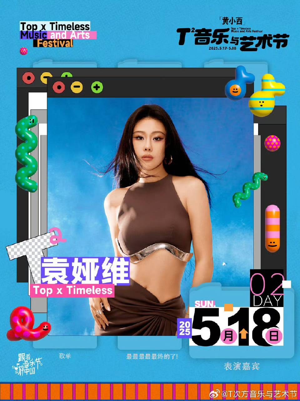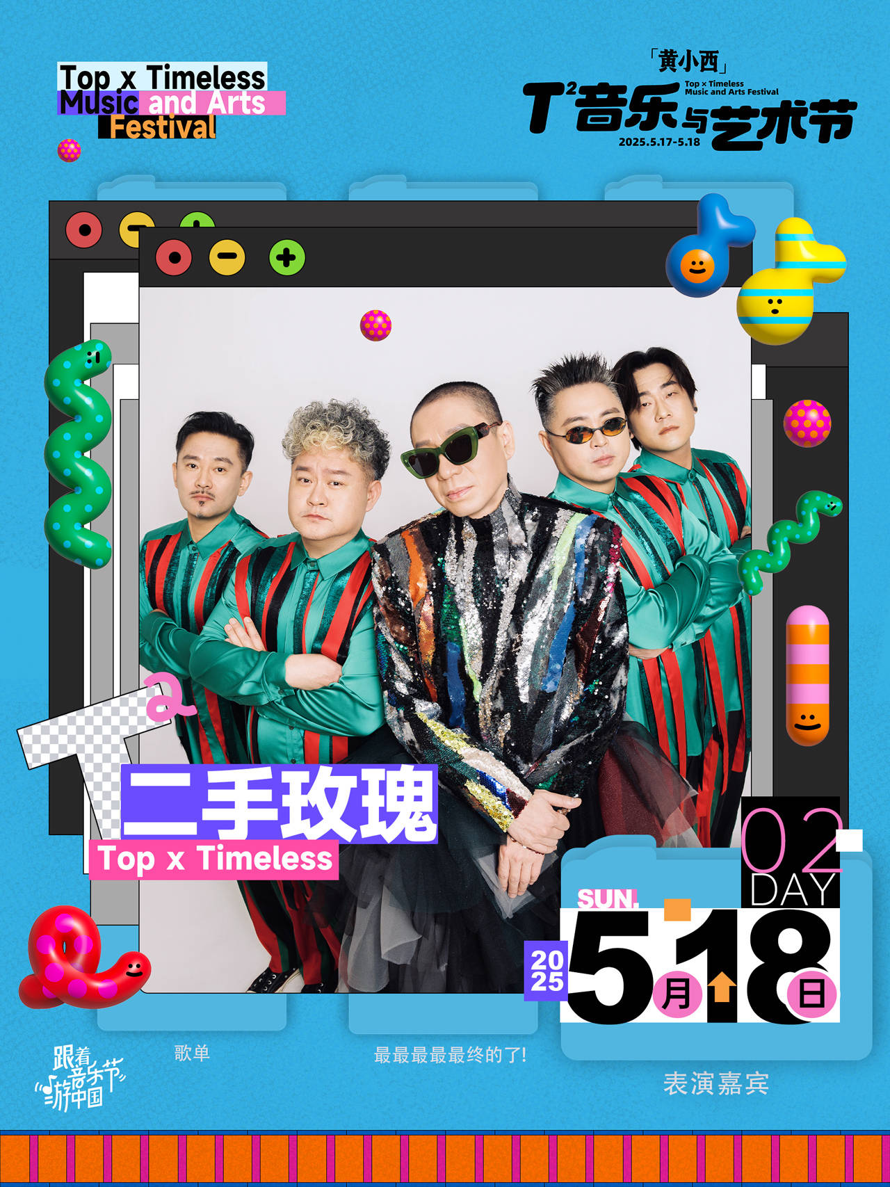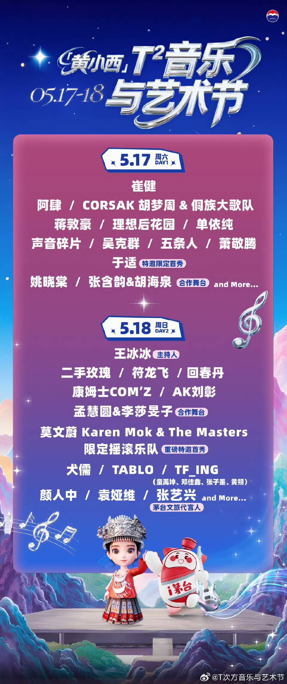 期待5月17日-5月18日的「黄小西」T²音乐与艺术节现场,崔健的摇滚声浪与萧敬腾的爆发舞台碰撞出火花,AK刘彰的激情rap与二手玫瑰的二人转美学同台争艳,乐迷们在音乐里为热爱沸腾。