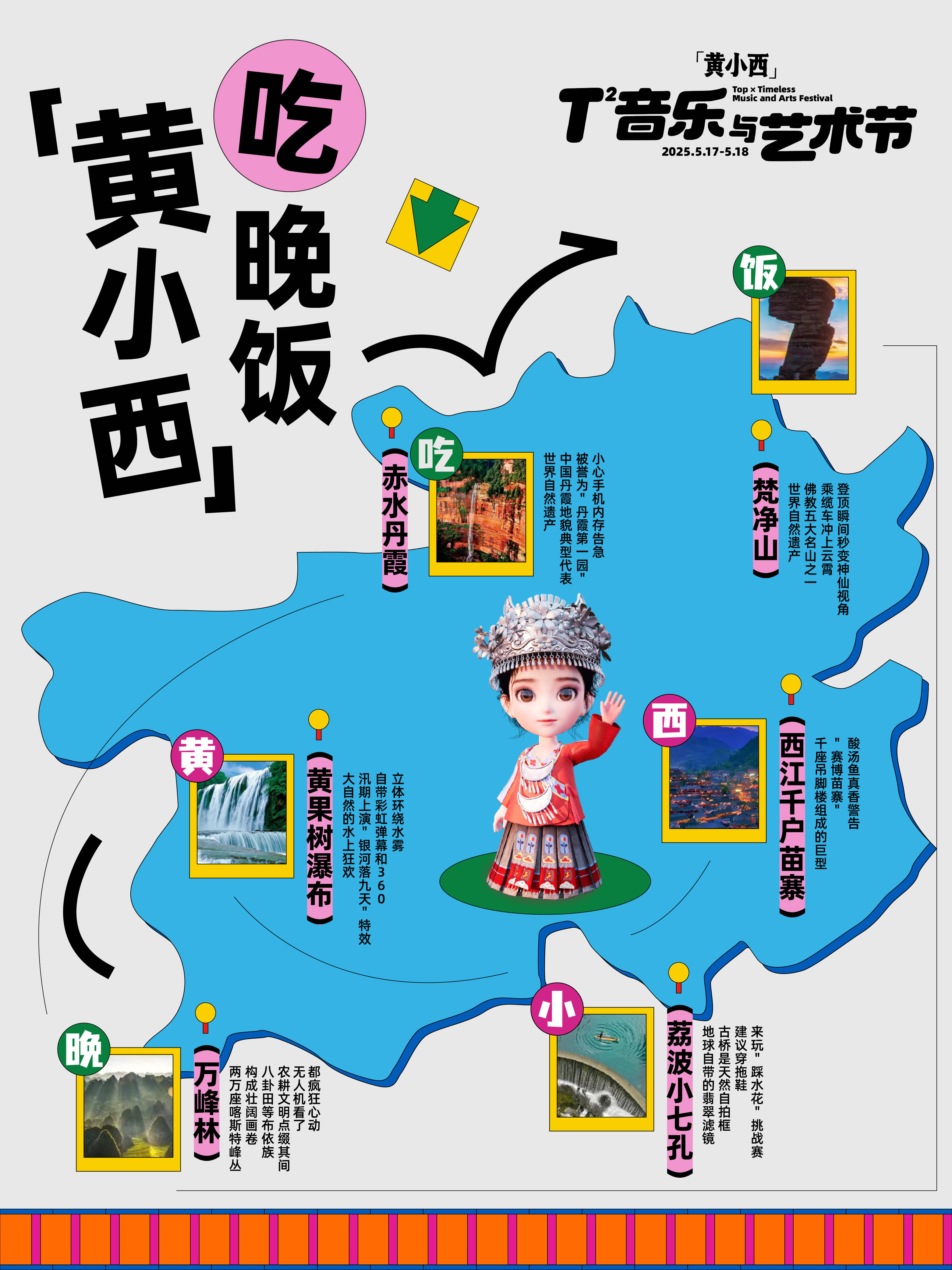 以"景"为乐,以"乐"为引。5月17日-5月18日,总台央视频将联合茅台文旅共同打造融合贵州自然景观与先锋音乐艺术的「黄小西」T²音乐与艺术节,为乐迷与旅游爱好者打造沉浸式生态艺术体验。此次音乐节除了音乐狂欢,还特别策划“黄小西吃晚饭”文旅创意旅行和“黄小西和朋友们的绿色节日”环保创意展览,为大家带来一场“音乐+文旅+环保”为一体的多元音乐盛会。