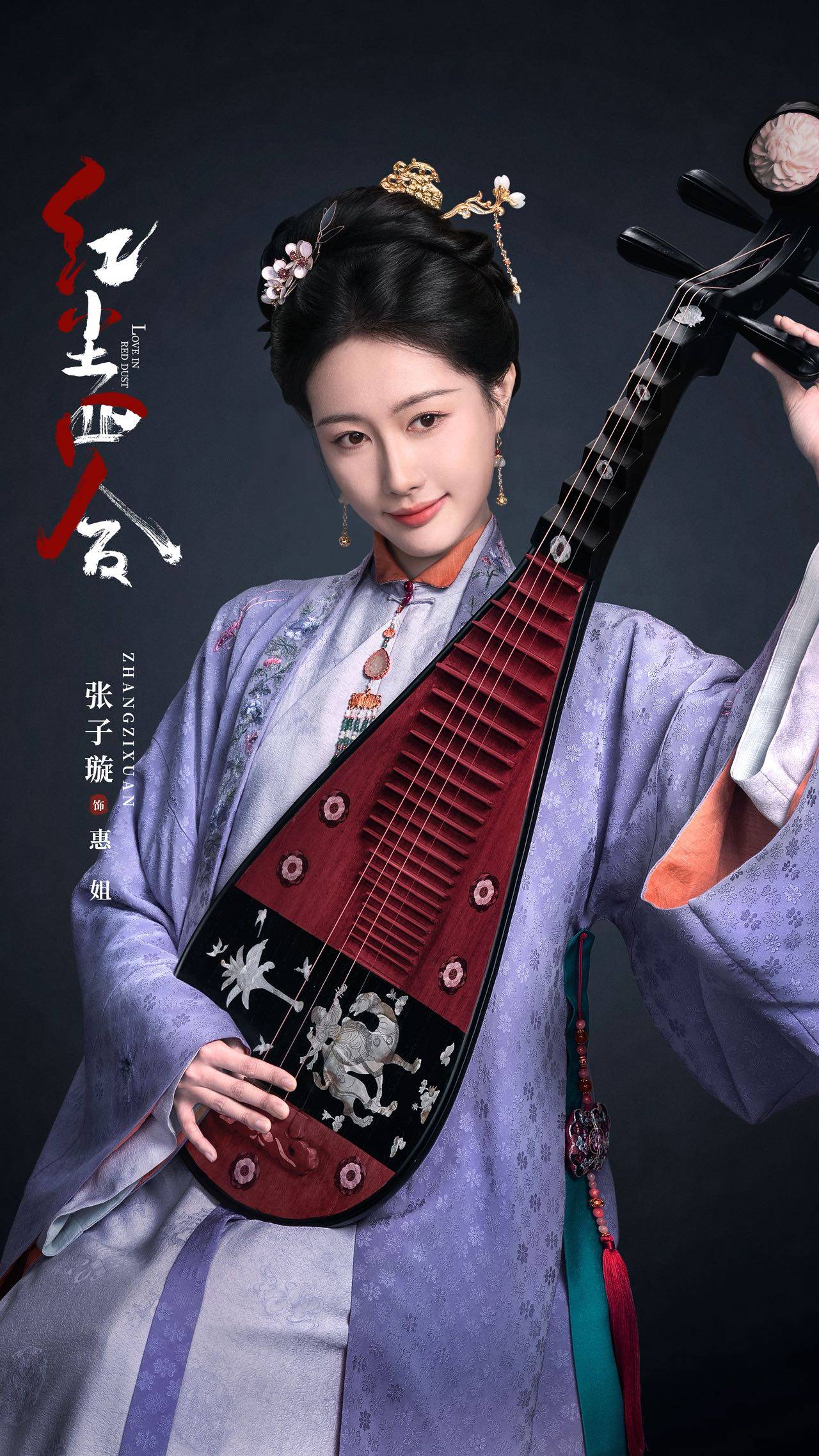 张子璇饰演的“惠姐”官宣海报尽显东方美学:紫色明制长衫绣银丝暗纹,搭配璎珞配饰,手持琵琶垂眸浅笑,指尖拨弦的动态设计暗藏 “欲语还休” 的叙事感。这一温婉中透着神秘的形象,与她在《惜花芷》中塑造的疯批反派 “花静” 形成强烈反差 —— 前者是病娇暗黑系代表,后者则是心怀大义的智谋女性,也展现了她从凌厉反派到飒爽侠女的戏路拓展。