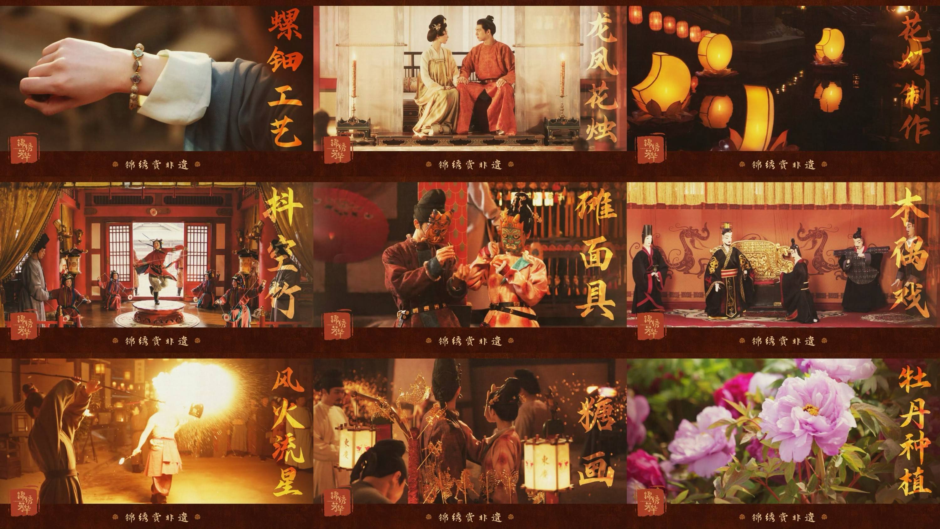 故事以盛唐为背景展开,巧妙融入了非物质文化遗产及传统习俗。除了服化道外,剧中再现了多种传统非遗文化如:镂空竹、傩面具、风火流星、长沙铜红釉、八角宫灯等,将非遗元素与国风美学进行融合。社交平台发起#各地文旅都来认领锦绣芳华的中国非遗#、#和杨紫李现沉浸式体验非遗盛宴#等话题讨论,各地文旅官方账号纷纷发文“认领”本土非遗,北京抖空竹、浙江龙凤花烛、陕西花灯、福建螺钿制作技艺、辽宁木偶戏、江西傩面具等成为近期文化热点,有效“盘活”中华文化资源宝库。剧中的古琴曲韵、唐风乐舞等,同样是对中华传统文化的艺术化呈现。特别是剧中一段融合传统非遗杂技与盛唐舞蹈的晚宴表演,技艺高超,编排震撼,观众在剧情自然推进中潜移默化感受到传统文化的深厚魅力,不少网友赞誉为“文化细糠”“够格上春晚”“原来传统文化也能这么潮”。