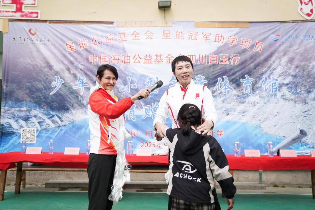 中国海油挂职干部、甘孜州农牧农村局副局长兼白玉县政府党组成员马尚尚期望:愿这座体育馆能够点燃同学们的运动热情,成为一片“风雨无阻”的活动空间。帮助同学们提高身体素质的同时体验运动的快乐,德智体全面发展。我们相信,健康的体魄和昂扬的精神,将是你们未来走向广阔天地最坚实的基础与财富。感谢北京星能公益基金会的大力支持,致敬奥运冠军们跨越高原与孩子们手拉手传递勇气与梦想!