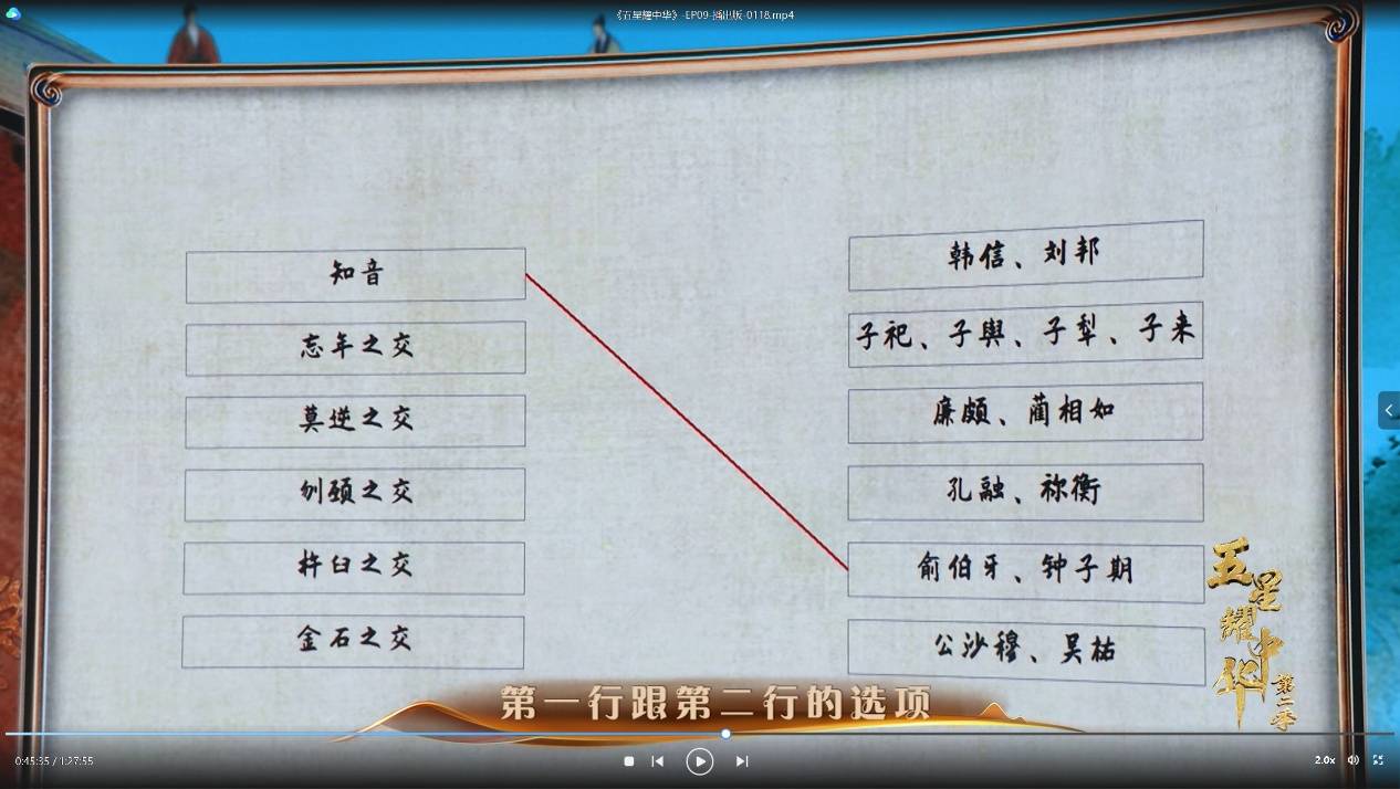 如果说赛制是节目的骨架,那么一道道精心设计的题目,便是附着其上的血肉与灵魂。第九期的题目,堪称一场“文明的微观巡礼”。一道关于“五彩绳”的题目,勾连起五色与五行、五方的古老哲学体系。钱文忠教授的解读,将这抹日常民俗色彩,还原为先民认知宇宙秩序的智慧结晶。另一道伏羲女娲图试题,答案直指“规”与“矩”。王立军教授阐释“规”圆象天、“矩”方象地,二者构成了“天圆地方”宇宙观。当“知音”“忘年交”等典故与其主人公相连时,一段关于中华传统友谊观与人格精神的图谱便徐徐展开。这些题目小中见大,将文明体系凝练于物件、图像、词汇之中,等待被重新发现。