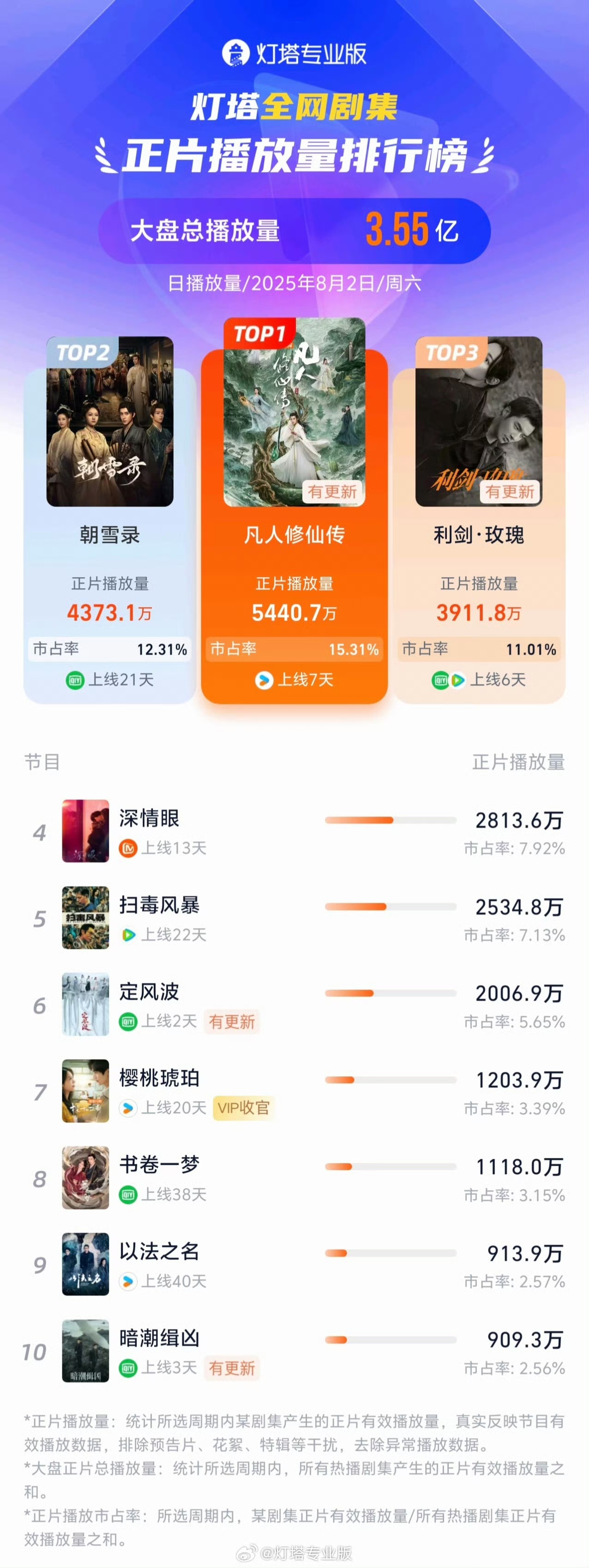 由杨洋领衔主演的《凡人修仙传》自开播以来热度持续上涨。该剧不仅在猫眼、德塔文、vlinkage等国内权威热度榜单上强势蝉联冠军席位,并以破竹之势登顶灯塔专业版“全网正片播放量”首位宝座,更成功辐射海外市场:登顶Netflix中国台湾地区收视TOP1,并在海外权威网站MyDramaList斩获8.1高分,真正实现了海内外观众同步入局的追剧热潮。杨洋以精湛入微的演技成功塑造了从凡人少年起步的韩立,将角色的坚韧、智慧与成长弧光演绎得极具信服力,引发海内外追剧热潮。