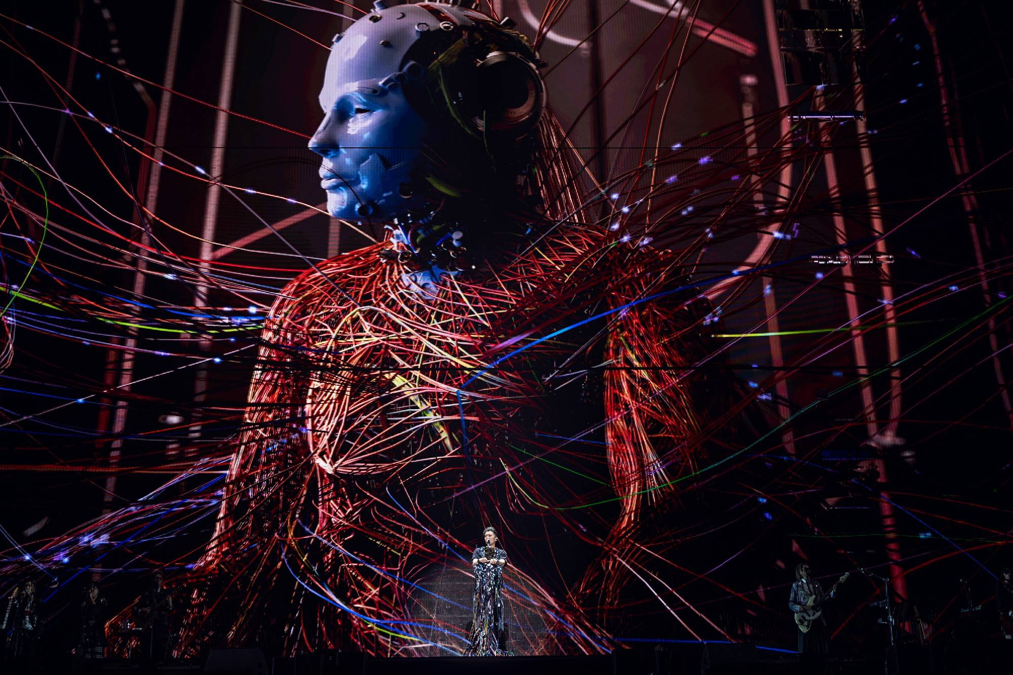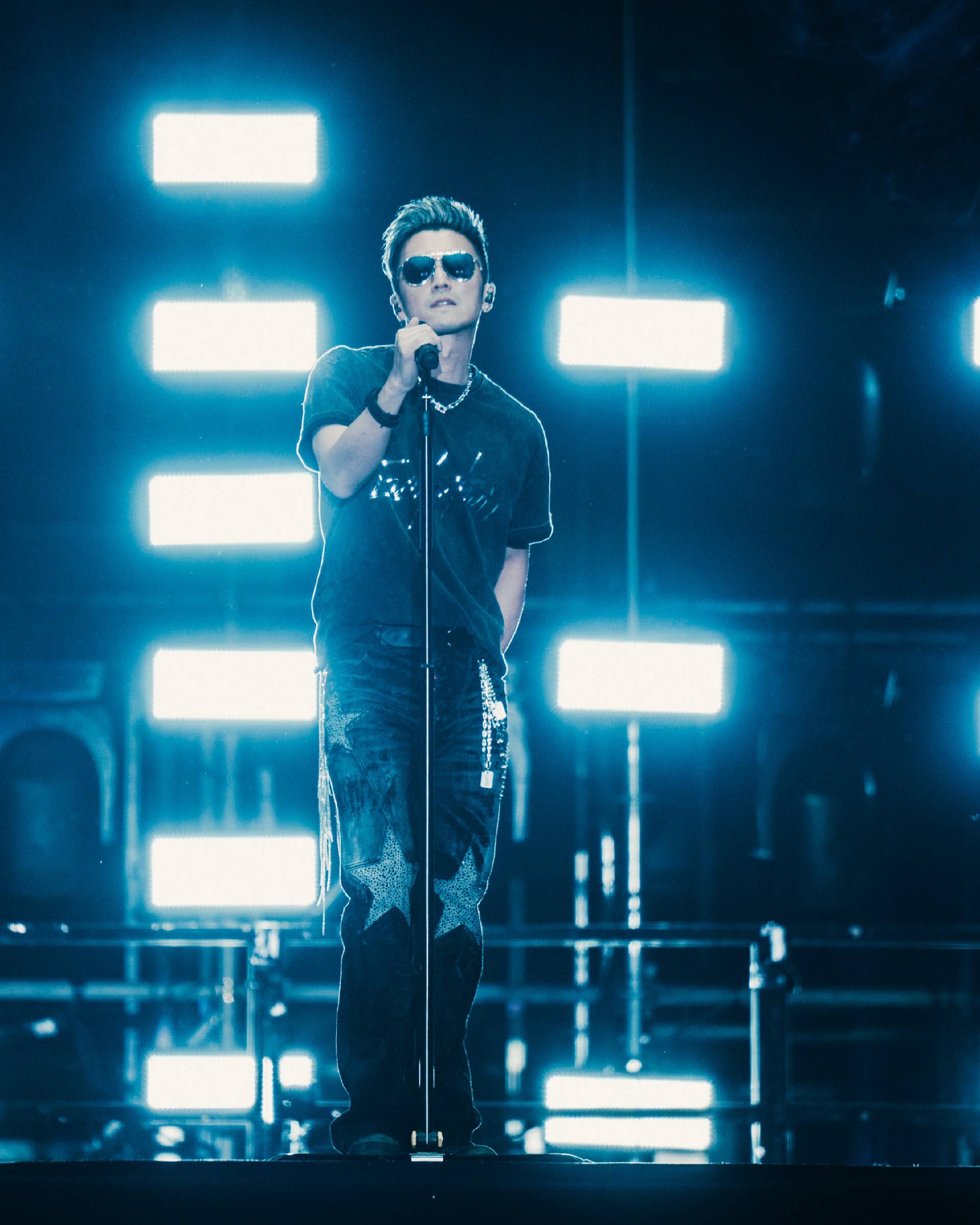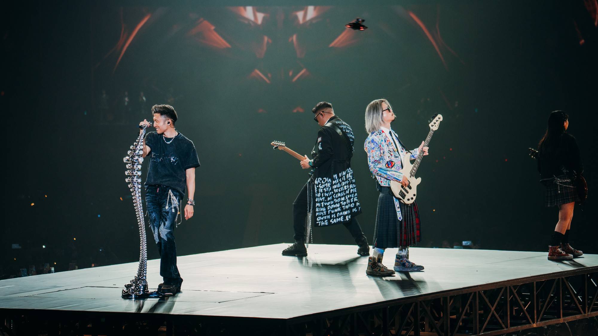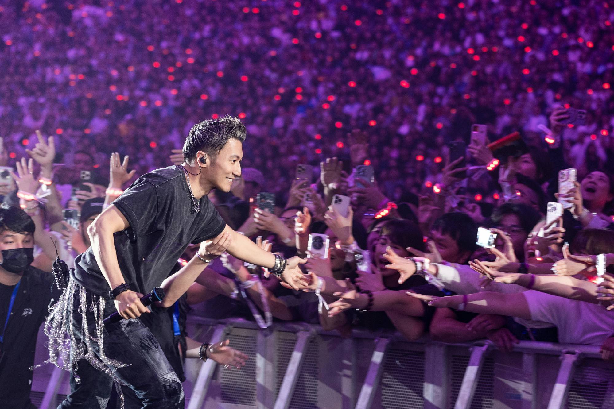 在连唱四晚的演出过程中,谢霆锋状态持续在线,每首金曲的舞台都给人留下十分深刻的印象。《爱最大》特别邀请王嘉尔录制rap部分,并在vcr中加入宣扬环保的内容,呼吁大家共同爱护地球。《黄种人》搭配以“万里长城”为灵感的定制麦架,展现文化自信与精神传承。除此之外《活火山》的喷火装置让人身临其境,《不是定理》的吉他solo主打硬控,最为经典的《活着VIVA》前奏一响便引燃氛围,还有《无声仿有声》《玉蝴蝶》《游乐场》等舞台的万人合唱引发全场泪目。