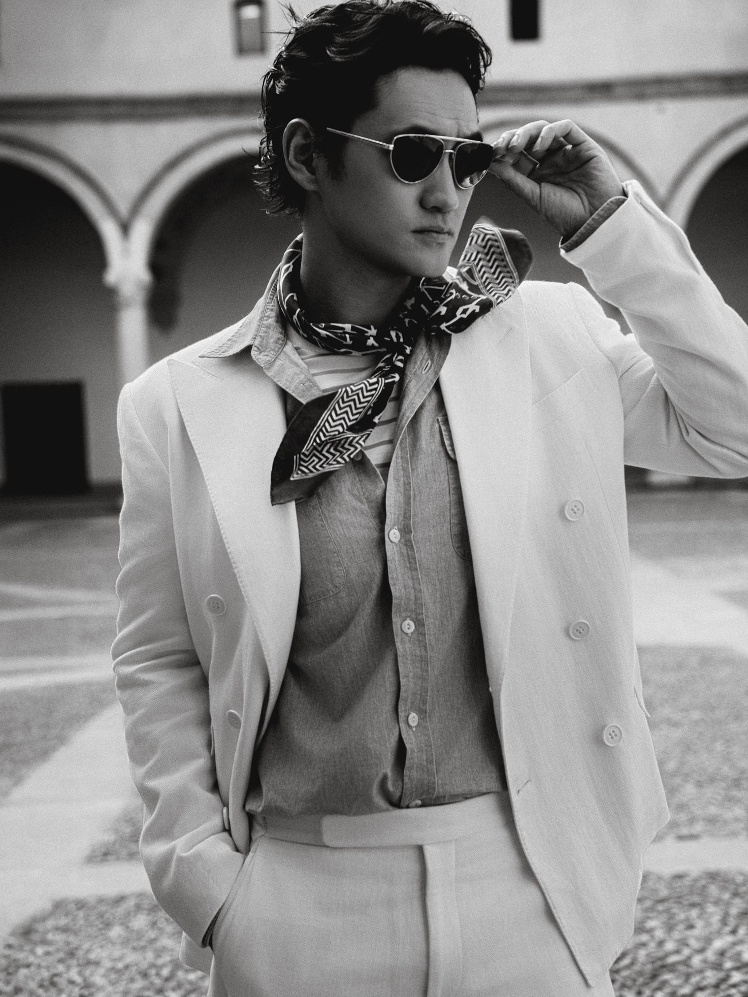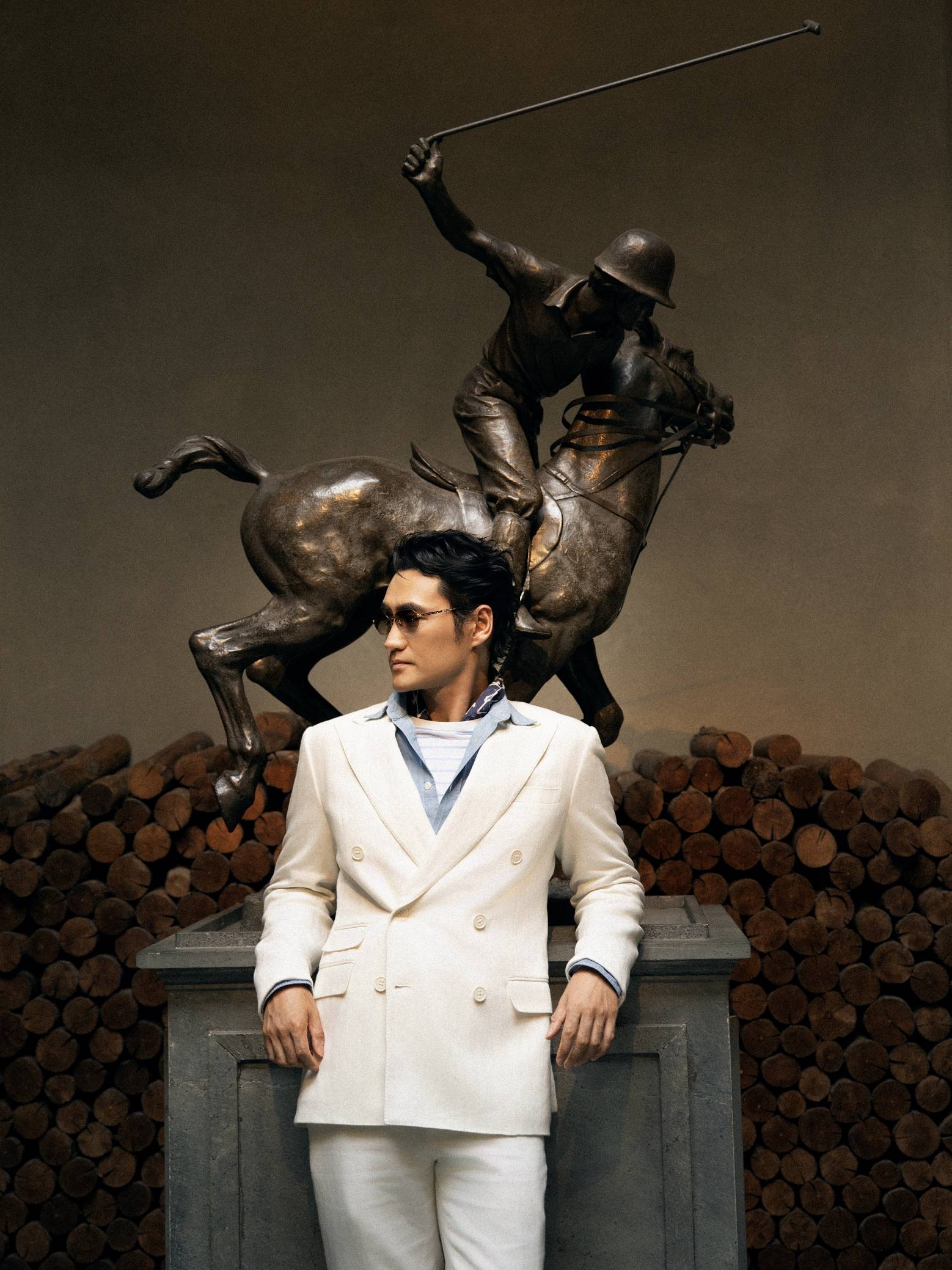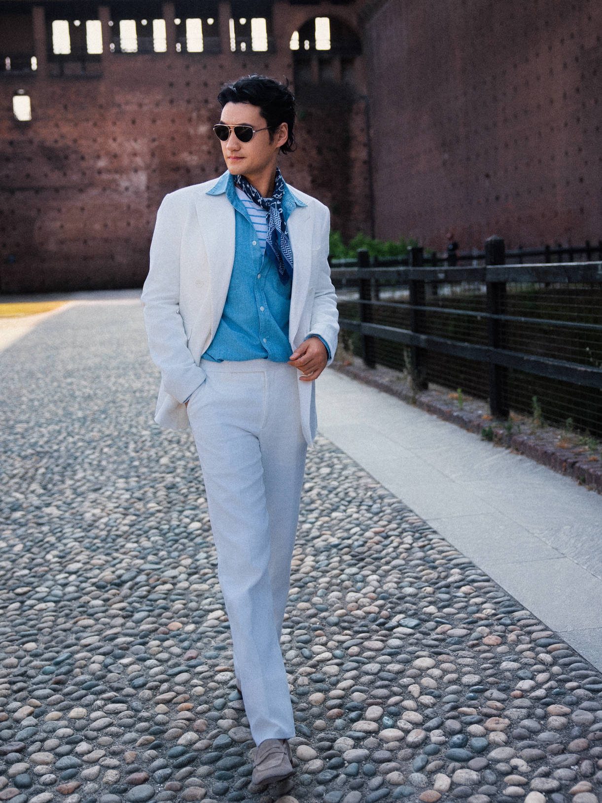 深邃眼神中透出的儒雅魅力,仿佛自带时光滤镜,赋予经典剪裁以鲜活生命,在米兰古旧步道上,袁弘闲庭信步的姿态本身,便是对经典永恒魅力生动的东方诠释。