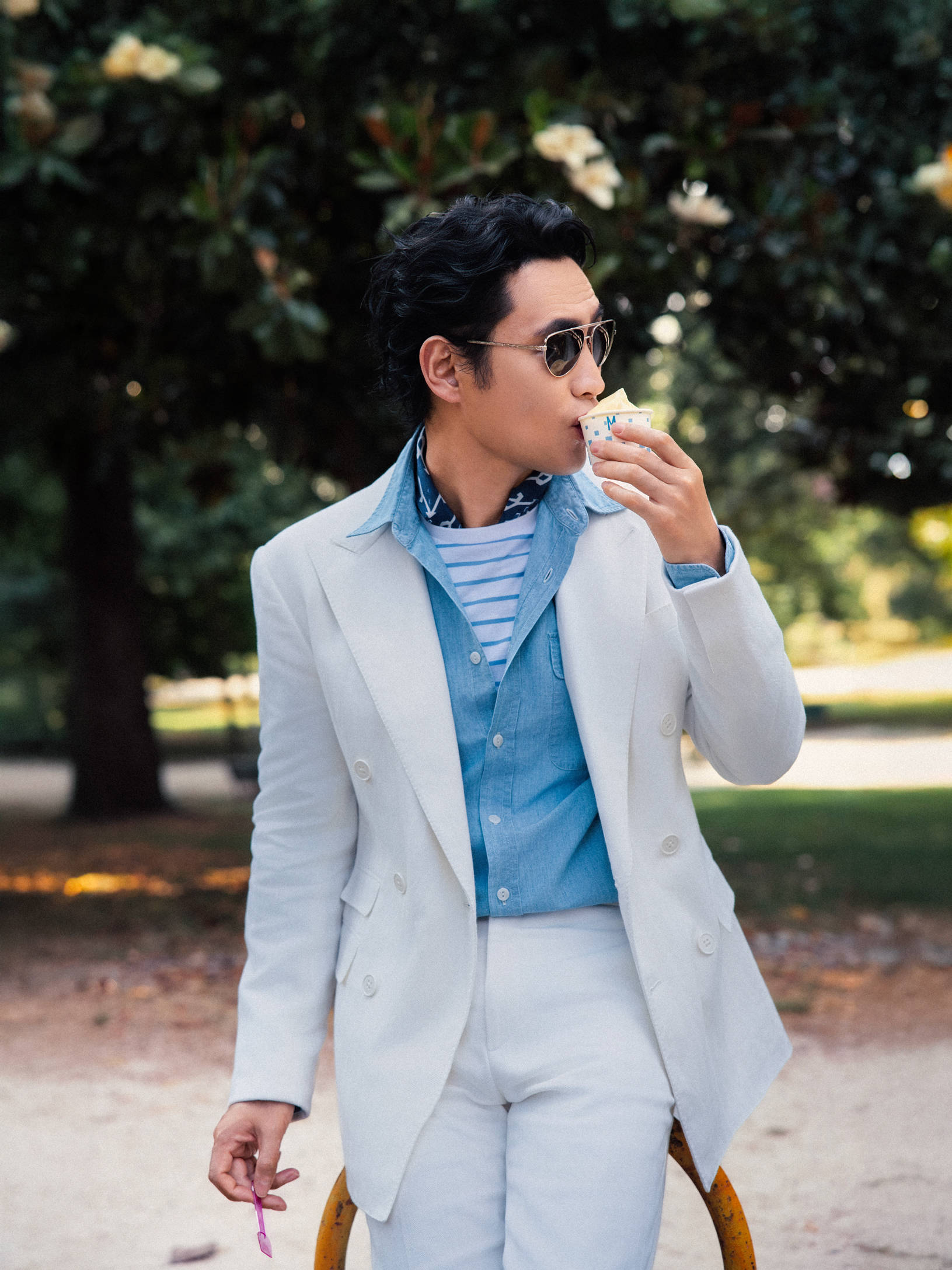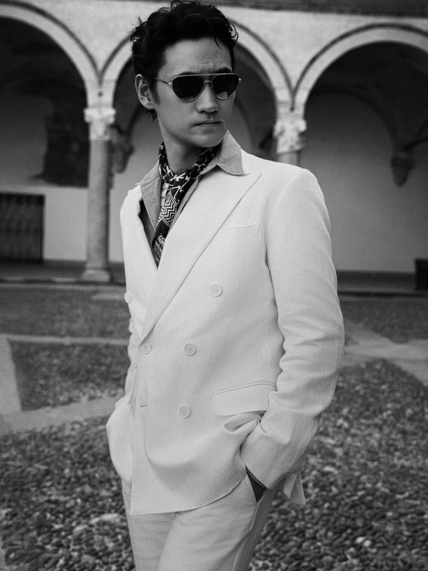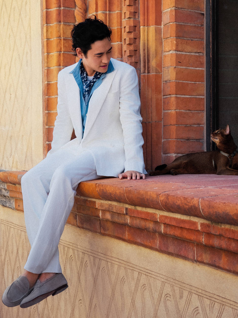 深邃眼神中透出的儒雅魅力,仿佛自带时光滤镜,赋予经典剪裁以鲜活生命,在米兰古旧步道上,袁弘闲庭信步的姿态本身,便是对经典永恒魅力生动的东方诠释。